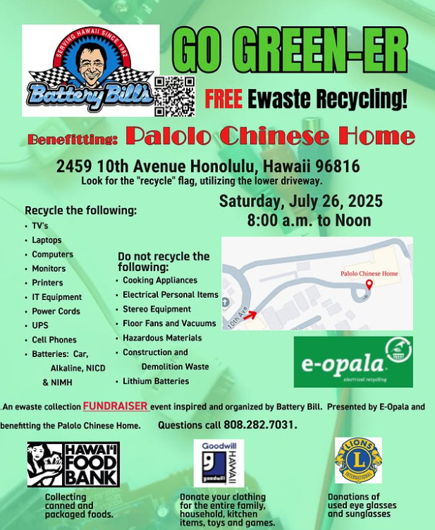 Battery Bill and Palolo Chinese Home are teaming up to host a free community recycling event focused on responsible e-waste disposal and giving back to local families.